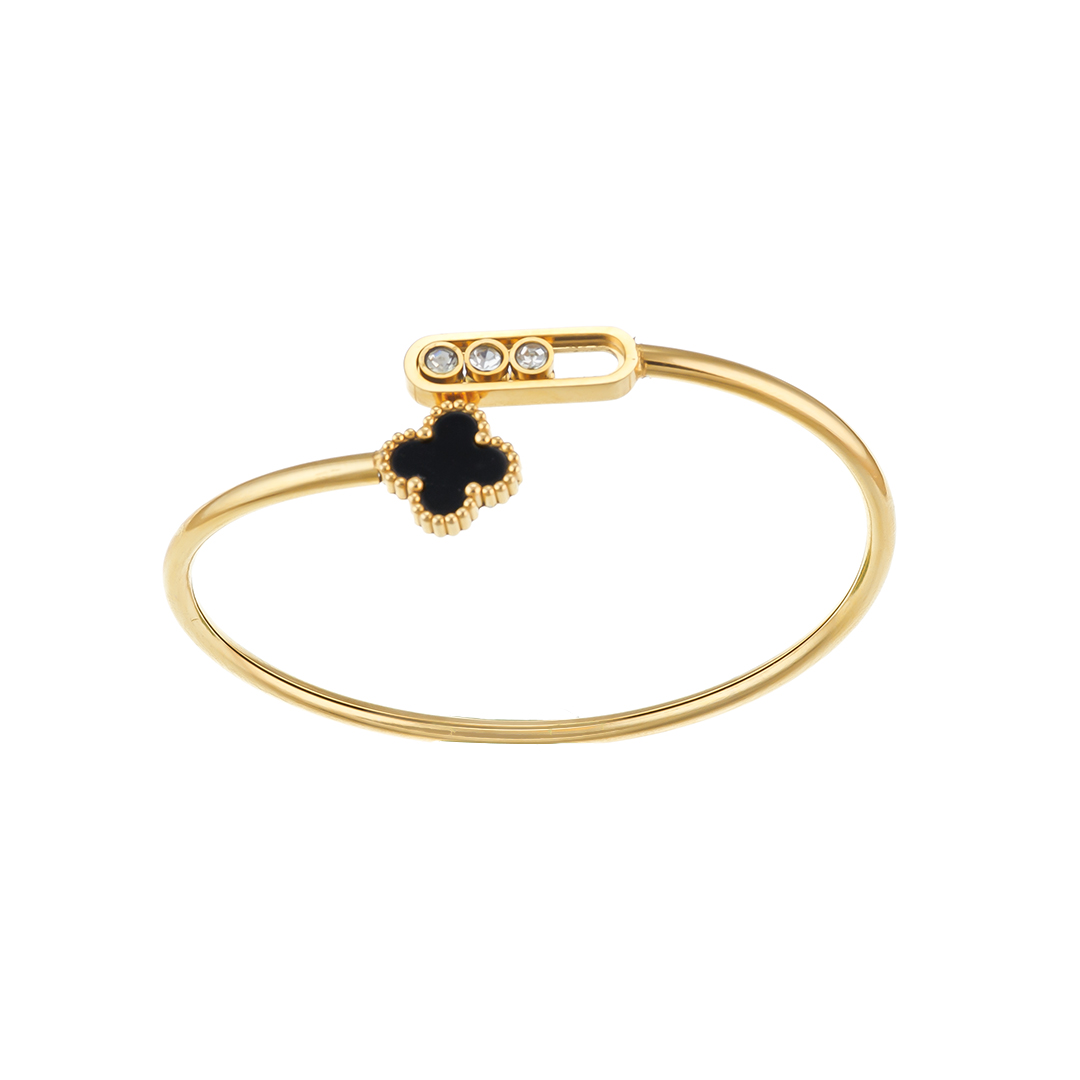 Bracelet Jonc Trèfle à Quatre Feuilles à émail noir et strass